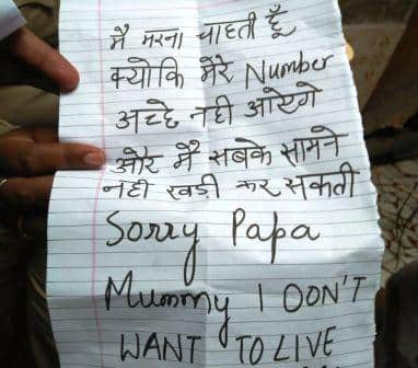 वाशिंग मशीन के अन्दर सुसाइड नोट मिला है. मृतका ने सुसाइड नोट में लिखा है,"मैं मरना चाहती हूं क्योंकि मेरे नंबर अच्छे नही आएंगे और मैं सबके सामने नहीं खड़ी रह सकती. sorry papa mummy I dont want to live."