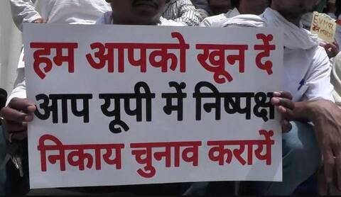 अपने खून से सीएम योगी को चिट्ठी लिखने वाले कांग्रेस कार्यकर्ताओं ने धमकी दी है कि अगर इस चुनाव में ईवीएम पर पाबंदी लगाकर बैलेट पेपर से मतदान नहीं कराया गया तो वह लोग सड़कों पर उतरकर हंगामा करने को मजबूर होंगे. प्रदर्शनकारी कांग्रेस कार्यकर्ता इससे पहले नगर निगम दफ्तर पर भी हंगामा कर चुके हैं.