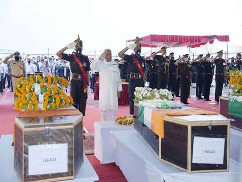मुख्यमंत्री नीतीश कुमार ने गुरुवार को पटना एयरपोर्ट पर भारत-चीन सीमा पर स्थित गैलवान घाटी में शहीद हुए भोजपुर जिले के ज्ञानपुरा, जगदीशपुर निवासी बिहार रेजिमेंट के 16वीं बटालियन के सिपाही चंदन कुमार, सहरसा जिले के गगांव आरन निवासी बिहार रेजिमेंट के 16वीं बटालियन के सिपाही कुंदन कुमार, समस्तीपुर जिले के गांव सुल्तानपुर पूरब, पटोरी निवासी बिहार रेजिमेंट के 16वीं बटालियन के सिपाही अमन कुमार, वैशाली जिले के ग्राम जनसाहा निवासी बिहार रेजिमेंट के 12वीं बटालियन के सिपाही जयकिशोर और साहेबगंज, झारखण्ड निवासी कुंदन कुमार ओझा के पार्थिव शरीर पर पुष्प-चक्र अर्पित कर उन्हें भावभीनी श्रद्धांजलि दी.