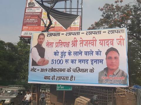 तेजस्वी के लापता वाला पोस्टर तमन्ना हाशमी की तरफ से लगाया गया है. वे खुद को सामाजिक कार्यकर्ता बता रहे हैं. पोस्टर में लिखा है, ''लापता-लापता-लापता-लापता...नेता प्रतिपक्ष तेजस्वी श्री तेजस्वी यादव को ढुंढ़ के लाने वाले को 5100 रुपये का नकद इनाम...नोट- 2019 के लोकसभा चुनाव के परिणाम के बाद से लापता हैं.’’ गौरतलब है कि बिहार में चमकी बुखार से लगातार बच्चों की मौत हो रही है लेकिन तेजस्वी यादव की तरफ से कोई भी बयान सामने नहीं आया है.