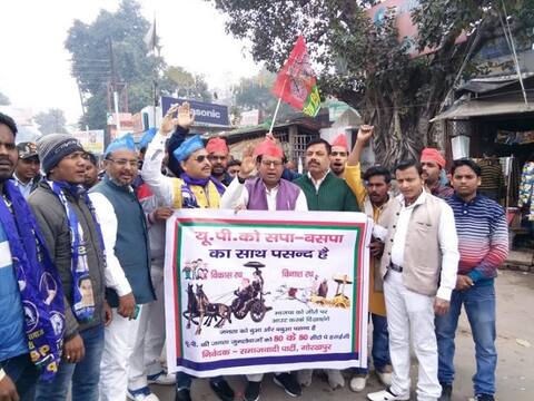 सपा के पूर्व नगर सचिव आफताब अहमद के नेतृत्व में शास्त्री चौक पर सपा कार्यकर्ताओं ने पोस्टर जारी किया. पोस्टर में समाजवादी पार्टी के राष्ट्रीय अध्यक्ष अखिलेश यादव और बसपा सुप्रीमो मायावती को विकास के रथ पर सवार दिखाया गया है. तो वहीं प्रधानमंत्री नरेंद्र मोदी और बीजेपी के राष्ट्रीय अध्यक्ष अमित शाह विनाश के रथ पर बैठे हैं. उसके ऊपर "यूपी को सपा-बसपा का साथ पसंद है." स्लोगन लिखा गया है.