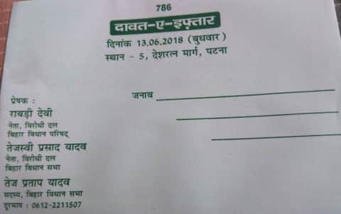दरअसल चारा घोटले में सजायाफ्ता लालू यादव मेडिकल बेल पर हैं, इसलिए वे किसी भी तरह के आयोजनों से दूर रह रहे हैं. इसी वजह से इस बार पटना में आयोजित 'दावत-ए-इफ्तार' के आमंत्रण पत्र में लालू यादव का नाम नहीं हैं. आयोजनकर्ता में लालू यादव का नाम देने से उनका बेल कैंसिल हो सकता था. इसलिए लालू यादव की जगह राबड़ी देवी, तेजस्वी यादव और तेजप्रताप यादव का नाम आमंत्रण पत्र में रखा गया है. कोई पहला मौका नहीं है कि आरजेडी की तरफ से इफ्तार पार्टी का आयोजन किया जा रहा है. पहले भी इफ्तार पार्टी का आयोजन होता रहा है लेकिन उन पार्टियों में लालू प्रसाद खुद मेजबानी करते नजर आते थे.