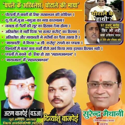 होर्डिंग में सबसे ऊपर पहली लाइन लिखी गयी है "घपले के अखिलेश, घोटाले की माया. इसके बाद एसपी-बीएसपी पर आरोपों की झड़ी लगायी गयी है. होर्डिंग में लिखा है घोटालो से बचने के लिए ''गठबंधन'' की कोशिश, यूपी में ''बुआ बबुआ'' का नया ''कारनामा'', जनता के पैसो की लूट का हिसाब देना होगा, अखिलेश ने नहीं दिया ''97 हजार करोड़'' का हिसाब, अखिलेश और मायावती ने गरीबों का पैसा खाया, मायावती ने किया ''14 सौ करोड़'' रुपये का घपला, विभागों में बजट कब कहा कैसे खर्च किया गया ''इसका हिसाब नहीं'', घपलों से बचने के लिए हो रहा ''गठबंधन'', ''मायाजाल'' में गठबंधन.