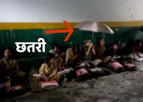 कानपुर: उत्तर प्रदेश के कानपुर जिले में खस्ताहाल सरकारी स्कूल में नन्हे बच्चे छाता लगाकर पढ़ने को मजबूर हैं. इस स्कूल की हालत इतनी खस्ता है कि टीचर को भी हाथ में छाता पकड़कर बच्चों को पढ़ाना पड़ रहा है. बच्चे मुख्यमंत्री योगी आदित्यनाथ से मदद की गुहार लगा रहे हैं.