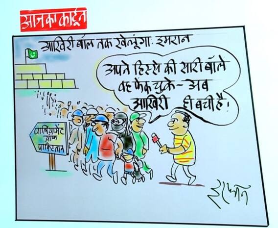 इरफान के कार्टून में पार्लियामेंट ऑफ पाकिस्तान के बाद सासंद की टोली दिख रही है. जिसमें एक सांसद मीडियाकर्मियों से बात करते हुए कहता है कि, अपने हिस्से की सारी बॉले वो फेंक चुके हैं-अब आखिरी ही बची है. कार्टून में इमरान का वो बयान लिखा जो बार-बार दोहराते दिखे हैं पिछले कुछ दिनों में. इमरान कहते हैं, आखिरी बॉल तक खेलूंगा.