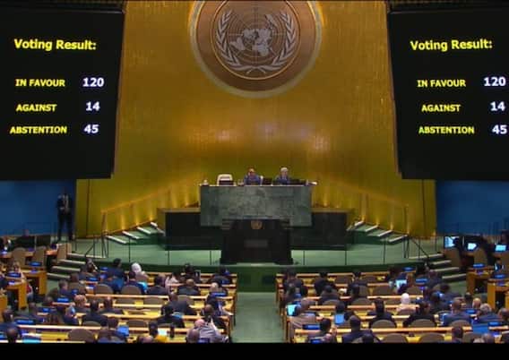 Palestine UN Proposal Amid Gaza Attack: संयुक्त राष्ट्र महासभा में शुक्रवार को इजरायल-हमास युद्ध रोकने के लिए प्रस्ताव लाया गया. इस प्रस्ताव में गाजा में इजरायली बमबारी पर रोक लगाने का आग्रह किया गया. 121 देशों ने इस प्रस्ताव पर सहमति जाहिर की जबकि अमेरिका समेत 14 देशों ने इसका विरोध किया.