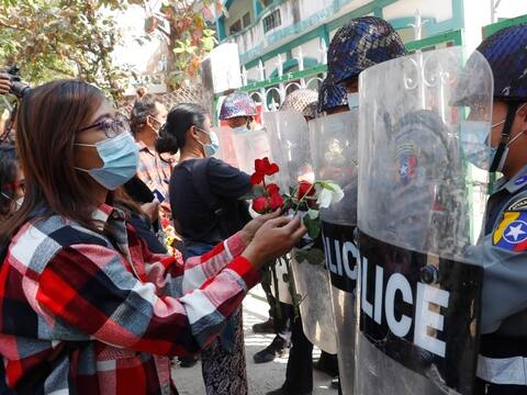 तख्तापलट के बाद से अब तक हुई सबसे बड़ी रैलियों के दौरान यंगून के दो विश्वविद्यालयों में प्रदर्शनकारियों ने विरोध के तौर पर तीन उंगलियों से सलामी दी. प्रदर्शनकारियों ने आंग सान सू ची के लिए लंबी आयु के नारे लगाए और कहा, ‘‘हम सैन्य तानाशाही नहीं चाहते.’’