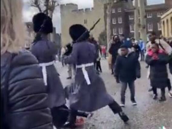 UK Viral Video: सोशल मीडिया पर एक वीडियो तेजी से वायरल हो रहा है. वायरल वीडियो ब्रिटेन के क्वींस गार्ड (Queen's Guard ) का है. वीडियो में ब्रिटेन के टॉवर ऑफ लंदन (Tower Of London) पर मार्च करते हुए शाही गार्ड के दो जवानों को दिखाया गया है. ग्रे कलर की वर्दी और टोपी के साथ शाही गार्ड के दो जवान मार्च कर रहे हैं. अचानक गार्ड के रास्ते में एक बच्चा आ जाता है. दोनों शाही गार्ड में से एक उस बच्चे को कुचलते हुए आगे बढ़ जाते हैं.