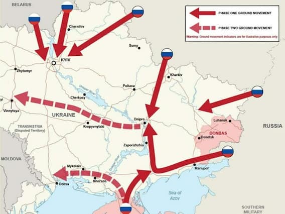 Russia Ukraine War: रूस का यूक्रेन पर हमले का दौर शुरू हो गया है. यूक्रेन की राजधानी कीव समेत अन्य शहरों में धमाको की आवाज़े सुनाई पड़ रही हैं. विस्फोट की आवाज क्रेमटोर्स्क और यूक्रेन के तीसरे सबसे बड़े शहर ओडेस्सा में भी सुनाई दे रही है. वहीं अब, यूके के रक्षा मंत्रालय ने एक मैप जारी करते हुए बताया कि, रूस किस तरह हमला कर सकता है इसकी आशंका इंग्लैंड के खुफिया विभाग ने पहले ही की थी जो अब हक्कीत में बदल रही है.