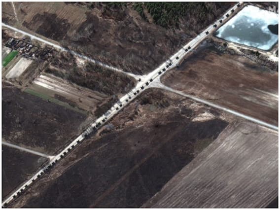 इन सैटेलाइट इमेज से पता चलता है कि रूसी सैनिक यूक्रेन पर कई मोर्चों पर हमला कर रहे हैं और कीव की तरफ आगे बढ़ रहे हैं. ये सैकड़ों बख्तरबंद गाड़ियों का काफिला है. इसमें कई टैंक हैं, हथियारों से लैस ट्रकों में तबाही का सामान लदा है.. ये लश्कर कीव से सिर्फ 25 किलोमीटर दूर है. इसके अलावा तस्वीर में कीव शहर के बाहर लड़ाई के निशान ही बाकी बचे दिख रहे हैं. तस्वीर में युद्ध में तबाही, एक टूटा हुआ पुल नजर आता है और कई नष्ट हो चुकी गाड़ियां दिख रही हैं.