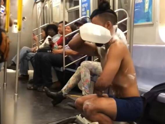 New York subway Bathing Video: अमेरिका (America) के न्यूयॉर्क सिटी (New York City) के मेट्रो ट्रेन की एक वीडियो वायरल हो रही है. सोशल मीडिया प्लेटफॉर्म पर एक वीडियो वायरल हो रहा है, जिसमें एक व्यक्ति न्यूयॉर्क सिटी ट्रेन के डिब्बे के अंदर नहाते हुए दिखाई दे रहा है. क्लिप में एक व्यक्ति को ट्रॉली बैग के अंदर घुसकर नहाने से पहले अपनी चप्पल, पैंट और शर्ट उतारते हुए दिखाया गया है.