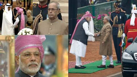 देख के 68वें गणतंत्र के परेड पर राष्ट्रपति के साथ यूएई के शहजादा शेख़ मोहम्मद बिन ज़ायेद अल नहयान. प्रधानमंत्री उनका स्वागत करते हुए.