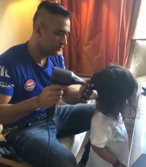 rnधोनी जीवा के बाल को ड्रायर से सुखा रहे हैं.