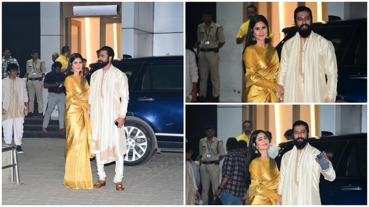 माथे पर बिंदिया, कानों में झुमके और पीली साड़ी पहन प्राण प्रतिष्ठा कार्यक्रम के लिए निकली कैटरीना कैफ, कुर्ते-पजामे में विक्की कौशल भी जंचे