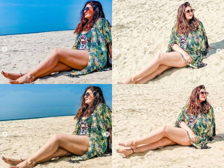 इन तस्वीरों में जूही समंदर किनारे रेत पर वन पीस ड्रेस पहने चील करती दिखाई दे रही हैं. (Photo Credit: @juhiparmar Instagram)