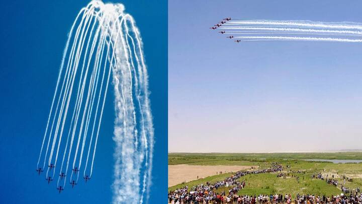 Patna Air Show: बाबू वीर कुंवर सिंह विजय दिवस पर सूर्यकिरण टीम के जरिए शानदार प्रस्तुति दी गई. टीम ने आकाश में बहद रोमांचकारी एरियल मैन्युवर प्रस्तुत किए.