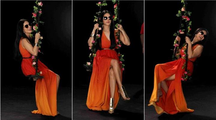 काला चश्मा और ऑरेंज ड्रेस में अपनी खूबसूरत अदाएं बिखेरती सनी लियोनी