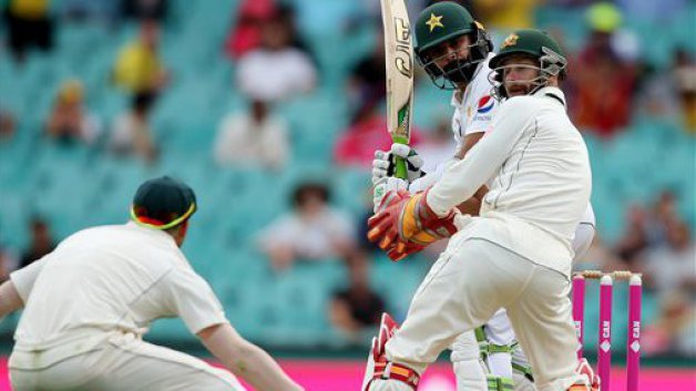 इससे पहले हेजलवुड ने शार्जील(चार) को स्पिन में रेनशॉ के हाथों कैच कराया जबकि चार गेंद बाद बाबर(शून्य) को पगबाधा आउट किया. दिन का खेल खत्म होने तक अजहर अली 58 रन पर खेल रहे थे जबकि यूनिस खान 64 रन बनाकर बल्लेबाज़ी कर रहे हैं. इससे पहले आस्ट्रेलियाई बल्लेबाजों के सामने पाकिस्तानी गेंदबाजों की एक नहीं चली. हैंड्सकाम्ब ने 110 रन बनाये और इस पारी में शतक जड़ने वाले तीसरे आस्ट्रेलियाई बल्लेबाज बने. उनसे पहले वार्नर(113) और रेनशॉ(184) ने सैकड़े जमाये थे. हैंड्सकाम्ब का यह चौथे टेस्ट मैच में दूसरा शतक है. वह बड़े अजीबोगरीब अंदाज में आउट हुए. उन्होंने वहाब रियाज की गेंद बैकफुट पर जाकर कट करनी चाही लेकिन इस प्रयास में उनके बल्ले से गिल्लियां गिर गयी और उन्हें हिटविकेट आउट दिया गया. उन्होंने 319 मिनट बल्लेबाजी की और 205 गेंदों का सामना करके नौ चौके लगाये.