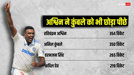 अश्विन ने इंग्लैंड के खिलाफ चौथे टेस्ट की दूसरी पारी में पांच विकेट चटकाए. इसके साथ ही उनके नाम भारत में अब 59 टेस्ट में 354 विकेट हो गए हैं. उन्होंने ओली पोप को आउट कर कुलंबे का रिकॉर्ड तोड़ा था. अनिल कुबंले के नाम भारत में 63 टेस्ट में 350 विकेट दर्ज हैं. वहीं अश्विन इंग्लैंड के खिलाफ 100 विकेट लेने वाले इकलौते भारतीय हैं.
