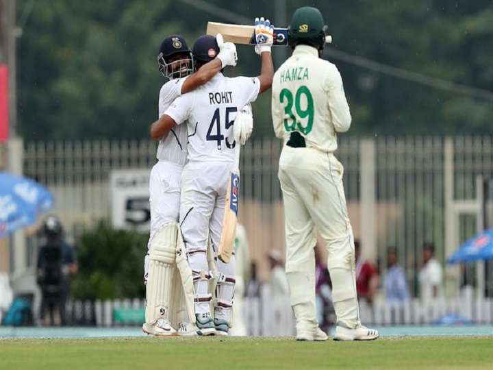 भारत और दक्षिण अफ्रीका के बीच यहां के झारखंड क्रिकेट संघ स्टेडियम में शनिवार से शुरू हुए तीसरे टेस्ट मैच के चायकाल के बाद का खेल खराब रोशनी के कारण रोक दिया गया है. खेल रोके जाने तक भारत ने टॉस जीतकर बल्लेबाजी करते हुए तीन विकेट पर 224 रन बना लिए थे. अपने करियर का छठा और इस सीरीज का तीसरा शतक लगाने वाले रोहित शर्मा 117 और अजिंक्य रहाणे 83 रनों पर नाबाद हैं. भारत ने मयंक अग्रवाल (10), चेतेश्वर पुजारा (0) और कप्तान विराट कोहली (12) के विकेट गंवाए हैं. भारत तीन मैचों की सीरीज में 2-0 की अजेय बढ़त हासिल कर चुका है.