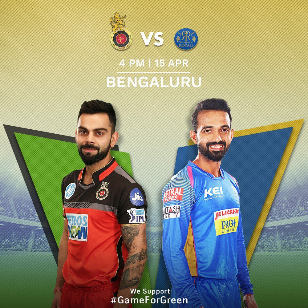 राजस्थान के लिए चिंता की बात यह है कि इस सीजन के उसके सबसे महंगे खिलाड़ी बेन स्टोक्स का बल्ला अभी तक खामोस है. स्टोक्स ने पहले दो मैचों में अब तक मात्र 21 रन ही बनाए हैं. रहाणे और संजू सैमसन को छोड़कर और कोई भी बल्लेबाज अपनी छाप छोड़ने में असफल रहे हैं. गेंदबाजी में बेन लागलिन और धवन कुलकर्णी ने दिल्ली के खिलाफ अच्छा प्रदर्शन किया था. लेकिन हैदराबाद के खिलाफ टीम विकेट के लिए तरस गई थी. दूसरे सबसे महंगे खिलाड़ी जयदेव उनादकट को भी प्रभावी गेंदबाजी करनी होगी. आरसीबी के हौसले बुलंदवहीं दूसरी तरफ बेंगलोर की टीम भी पिछले दो मुकाबलों में सिर्फ एक ही जीत पाई है. टीम ने शुक्रवार को किंग्स इलेवन पंजाब को तीन गेंद पहले चार विकेट से हराया है. इस जीत से टीम का मनोबल बढ़ा है. बेंगलोर के लिए अच्छी बात यह है कि उसके विस्फोटक बल्लेबाज अब्राहम डीवीलियर्स फॉर्म में लौट आए हैं. डीवीलियर्स ने पंजाब के खिलाफ 50 रन बनाए थे. गेंदबाजी में उमेश यादव ने पंजाब के खिलाफ तीन विकेट झटके थे. बल्लेबाजों और गेंदबाजों के शानदार फॉर्म को देखते हुए बेंगलोर अपने घर में लगातार दूसरी जीत दर्ज करना चाहेगी. बदली हुई जर्सी में उतरी आरसीबीपिछले कुछ सालों से आरसीबी की टीम अपने घर में एक मैच ग्रीन जर्सी में खेलती है. आरसीबी इसे ग्रीन पर्यावरण के मुहिम को लेकर करती है टॉस - आरसीबी के कप्तान विराट कोहली ने टॉस जीत कर पहले गेंदबाजी करने का फैसला किया है. बदलाव - आरसीबी ने रिटेन किए गए खिलाड़ी सरफराज खान को प्लेइंग इलेवन से बाहर कर दिया है. उनकी जगह स्पिन ऑलराउंडर पवन नेगी को टीम में शामिल किया है. राजस्थान ने अपनी टीम में कोई बदलाव नहीं किया है. टीम - रॉयल चैलेंजर्स बैंगलोर की टीम - क्विंटन डी कॉक, ब्रेंडन मैकुलम, विराट कोहली, एबी डिविलियर्स, पवन नेगी, मनदीप सिंह, वाशिंगटन सुंदर, क्रिस वोक्स, कुलवंत खेजरोलिया, उमेश यादव, युजवेन्द्र चहल राजस्थान की टीम - अजिंक्य रहाणे (सी). डी 'अर्सी शॉर्ट, संजू सैमसन, बेन स्टोक्स, राहुल त्रिपाठी, जोस बटलर, कृष्णप्पा गोथम, श्रेयस गोपाल, धवल कुलकर्णी, जयदेव उनादकट,बेन लॉघलिन