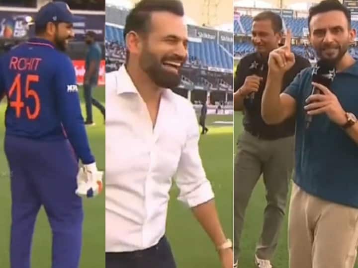 Jatin Sapru and Rohit Sharma: यूएई में चल रहे एशिया कप (Asia Cup 2022) से एक मजेदार वीडियो सामने आया है. यह वीडियो भारत और हॉन्ग कॉन्ग (IND vs HK) के मैच से ठीक पहले का है. इस वीडियो में टीवी एंकर जतिन सप्रू (Jatin Sapru) फैंटेसी टीम की कप्तानी को लेकर अपनी बात रखते नजर आ रहे हैं, लेकिन तभी जब वह देखते हैं कि रोहित शर्मा (Rohit Sharama) उनके नजदीक ही खड़े हैं तो वह एकदम बात पलट देते हैं. इस पर रोहित शर्मा तो मजेदार रिएक्शन देते ही हैं, उनके साथ-साथ पूर्व क्रिकेटर इरफान पठान और संजय बांगर भी अपनी हंसी रोक नहीं पाते हैं.