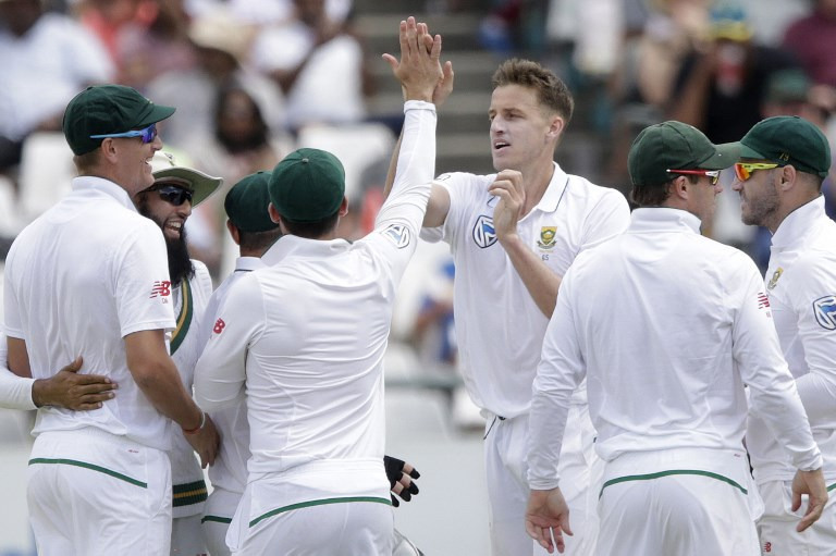 बारिश के बाद भारतीय गेंदबाजों का जलवा- इसके चार ओवर बाद शमी ने नाइटवाचमैन रबादा (पांच) को दूसरी स्लिप में कैच कराया. कप्तान फाफ डु प्लेसिस (शून्य) भी नहीं टिक पाए. बुमराह ने उन्हें विकेटकीपर साहा के हाथों कैच कराकर स्कोर पांच विकेट पर 82 रन कर दिए. साहा ने इस मैच में दस कैच लिए जो भारतीय रिकॉर्ड है.बुमराह ने इसके बाद डिकॉक (आठ) को भी पवेलियन भेजकर स्कोर छह विकेट पर 92 रन कर दिया. एबी डिविलियर्स (35) ने एक छोर संभाले रखा और इस बीच दो चौके और दो छक्के लगाए. उन्हें हालांकि दूसरे छोर से कोई मदद नहीं मिली. शमी ने फिलैंडर (शून्य) को पगबाधा आउट करके अपने सुबह छह ओवर में 11 रन देकर तीन विकेट हासिल कर दिये.साउथ अफ्रीका ने 35वें ओवर में 100 रन की संख्या पार की. महाराज (15) ने कुछ शॉट लगाये. इसके बाद भुवनेश्वर (33 रन देकर दो विकेट) गेंदबाजी के लिये आये और उन्होंने महाराज को विकेट के पीछे कैच कराया. साहा ने मैच का अपना दसवां कैच भुवनेश्वर की गेंद पर मोर्ने मोर्कल (दो) का लिया.साहा ने एक मैच में सर्वाधिक शिकार का महेंद्र सिंह धोनी का भारतीय रिकॉर्ड तोड़ा जिन्होंने अपने आखिरी टेस्ट मैच में मेलबर्न में 2014 में ऑस्ट्रेलिया के खिलाफ नौ शिकार किए थे जिसमें आठ कैच और एक स्टंप शामिल है. बुमराह ने आखिर में डिविलियर्स को सीमा रेखा पर कैच कराया जो तेजी से रन बनाने के प्रयास में लंबा शॉट खेलना चाह रहे थे. डेल स्टेन टखने की चोट के बावजूद बल्लेबाजी के लिये उतरे और आखिर में नाबाद रहे.
