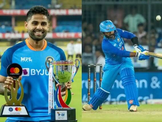 Suryakumar Yadav on Dinesh Karthik: टीम इंडिया के धाकड़ बल्लेबाज सूर्यकुमार यादव (Suryakumar Yadav) ने इंदौर टी20 में दिनेश कार्तिक (Dinesh Karthik) की विस्फोटक पारी पर मजेदार रिएक्शन दिया है. उन्होंने कहा है कि जिस तरह दिनेश कार्तिक बल्लेबाजी करते हैं, उसे देख उन्हें अपने नंबर-4 का बल्लेबाजी क्रम खतरे में नजर आता है. सूर्यकुमार यादव ने 'प्लेयर ऑफ दी सीरीज' अवॉर्ड लेते वक्त यह बात कही.