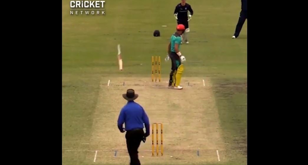 WATCH: बल्लेबाज़ के सिर के ऊपर से जाकर 'बल्ले' ने उड़ाई 'बेल्स'