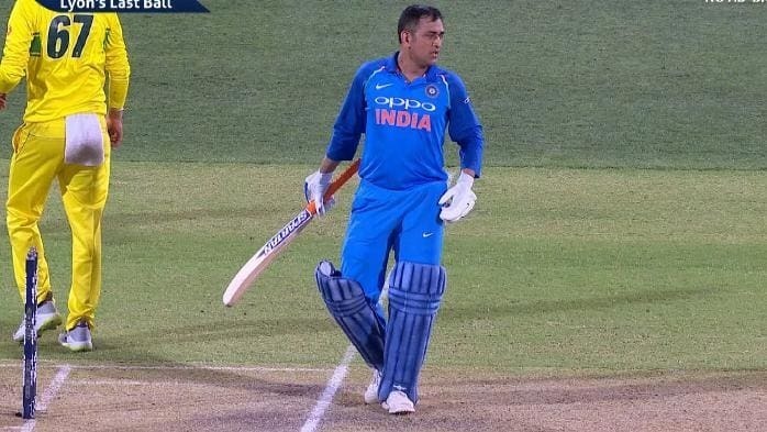 जी हां, बीते दिन ऑस्ट्रेलिया के खिलाफ जब टीम इंडिया लक्ष्य का पीछा कर रही थी जो पारी के 45वें ओवर में ऑस्ट्रेलियाई कप्तान एरॉन फिंच ने नैथन लायन को गेंद सौंपी. लायन के ओवर की आखिरी गेंद पर धोनी ने ऑन-साइड पर एक रन चुराया. लेकिन वो रन पूरा करना ही भूल गए. यानि कि वो नॉन स्ट्राइकर एंड पर तो आए लेकिन बल्ला क्रीज़ में टिकाए बिना ही वापस लौट गए.