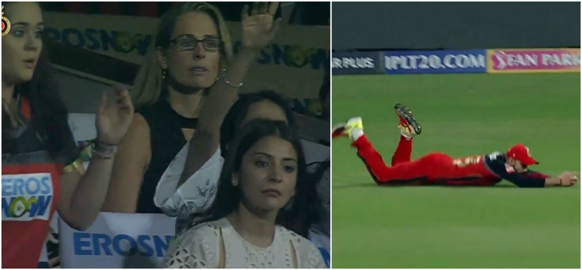 लॉन्ग ऑन पर तेज़ी से दौड़ते हुए डाइव लगाकर विराट कोहली ने इतना शानदार कैच पकड़ा जिसे सभी देखते रह गए. इतना ही नहीं विराट की लेडी लक अनुष्का शर्मा का रिएक्शन इस कैच पर देखने लायक था. उन्होंने इस तरह रिएक्ट मानो उन्हें यकीन ही ना हुआ हो कि विराट ने इतना मुश्किल कैच आसानी से लपक लिया.