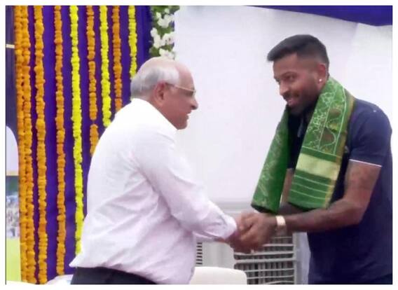 Gujarat Titans Felicitated: गुजरात टाइटंस ने राजस्थान रॉयल्स को हराकर आईपीएल 2022 का खिताब अपने नाम कर लिया है. राजस्थान रॉयल्स के बाद वो अपने डेब्यू सीजन में आईपीएल का खिताब अपने नाम किया है. इस जीत के बाद गुजरात के CM भूपेंद्र पटेल ने पूरी टीम से मुलाकात की और इस दौरान उन्होंने टीम के कप्तान हार्दिक पांड्या को स्मृति चिन्ह भी भेंट किया.