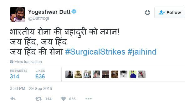 उरी हमले के बाद भारत ने अपने जवानों की शहादत का पाकिस्तान को मुंह तोड़ जवाब देते हुए भारत ने पाकिस्तान के कब्जे वाले कश्मीर में घुसकर 40 आतंकवादियों को मार गिराया इसके बाद खेल जगत की तमाम दिग्गजों ने भारतीय सेना द्वारा किए गए इस सर्जिकल स्ट्राइक का भरपूर समर्थन किया है.