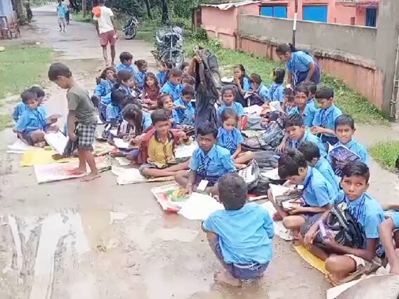 सड़क पर बैठकर पढ़ने की यह तस्वीर बांका जिले के अमरपुर प्रखंड अंतर्गत विशनपुर पंचायत के मझगांय गांव स्थित प्राथमिक विद्यालय की है. बीते 3-4 दिनों से हो रही मूसलाधार बारिश के चलते यह समस्या उत्पन्न हुई है. यहां विद्यालय परिसर पूरी तरह से जलमग्न हो गया है. बारिश का पानी विद्यालय परिसर के साथ-साथ स्कूल की सभी कक्षाओं में भर गया है जिसकी वजह से विद्यालय में पढ़ने वाले छात्र गुरुवार (05 अक्टूबर) को खुले आसमान के नीचे सड़क पर बैठकर पढ़ने को मजबूर हो गए हैं. बताया गया कि स्कूल की छत गिर सकती है. ढलाई फट गई है.