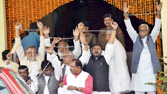 उधर हाथों में जंजीर बांधे पहुंचे लेफ्ट के विधायक सदन के अंदर पहुंचे. सदन के अंदर बीजेपी विधायकों ने वाम दल के विधायकों को बेऊर जेल जाने की सलाह दे दी जिसके बाद हंगामा होने लगा. इस पर विधानसभा के स्पीकर नंदकिशोर यादव ने बीजेपी के विधायक को डांटते हुए चुप रहने के लिए कहा.