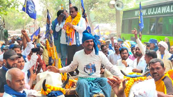 बैलगाड़ी पर नामांकन करने पहुंचे बीएसपी प्रत्याशी