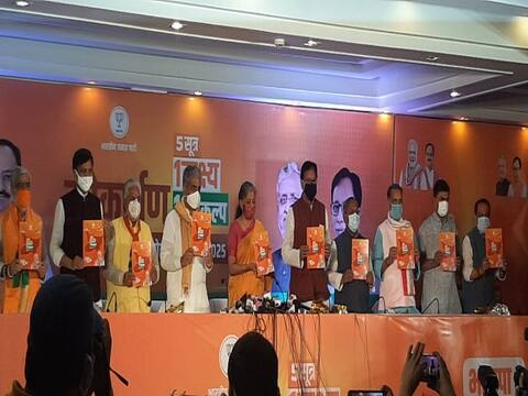 पटना: भाजपा ने बिहार चुनाव के लिये जारी किया अपना घोषणा पत्र,वित्त मंत्री निर्मला सीतारामन ने घोषणा पत्र का किया लोकार्पण. इस मौके पर भाजपा के तमाम नेता केन्द्रीय मंत्री अश्विनी चौबे,भूपेंद्र यादव,नित्यानंद राय ,राधा मोहन सिंह समेत कई नेता मंच पर मौजूद रहे. इस संकल्प पत्र में 5 सूत्र ,1 लक्ष्य,11 संकल्प हैं मौजूद.