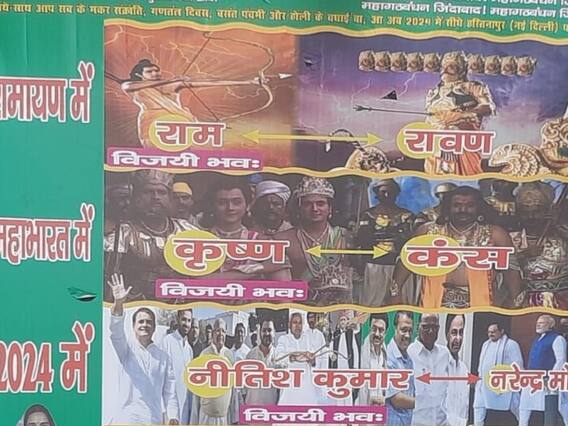 बता दें कि जेडीयू कार्यालय के बाहर लगा एक पोस्टर शनिवार को सुर्खियों में आ गया. इस पोस्टर में राम-रावण, कृष्ण-कंस और 2024 में सीएम नीतीश कुमार और पीएम नरेंद्र मोदी को दिखाया गया है. अब इस पोस्टर को लेकर राजनीतिक बयानबाजी शुरू हो गई है. जेडीयू के समर्थकों ने इस पोस्टर के माध्यम से बीजेपी और नरेंद्र मोदी पर निशाना साधा है तो वहीं, बीजेपी के नेता ट्वीट कर नीतीश कुमार और तेजस्वी यादव पर हमला बोला है. वहीं, नीतीश कुमार इन दिनों केंद्र की राजनीति को लेकर चर्चा में हैं. इस वजह से जेडीयू अब लगातार केंद्र की सरकार को आड़े हाथों ले रही है.