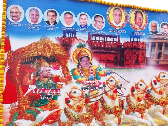 पोस्टर में ललन सिंह सीएम नीतीश कुमार के सारथी यानी कृष्ण भगवान बन कर उनकी रथ को संभाल रहे हैं. पीछे अर्जुन बने नीतीश कुमार विरोधी पर निशाना लगा रहे हैं. लोकसभा चुनाव में रणक्षेत्र की चक्रव्यूह को तोड़ने के लिए उपेंद्र कुशवाहा को अभिमन्यु के रूप में पोस्टर के जरिए दिखाया गया है. प्रधानमंत्री नरेंद्र मोदी को धृतराष्ट्र दिखाया गया है. रथ के माध्यम से रोजगार के लिए युवाओं को प्रेरित कर डाक पत्र के माध्यम केंद्र की मोदी सरकार से और रोजगार मांगने का काम करेंगे.