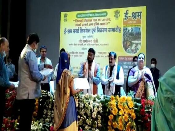 पटना: क्या बिहार में ई-श्रम कार्ड बनाने के नाम पर वसूली का काम चल रहा है? क्या रोजगार पाने के लिए श्रमिकों को पैसे देने पड़ रहे हैं? ये सवाल इसलिए उठ रहा है क्यूंकि किरण देवी नाम की एक श्रमिक महिला ने पूरे सिस्टम की पोल खोल कर रख दी है. दरअसल, बिहार के मजदूरों को केंद्र सरकार के ई-श्रम योजना से जोड़ने को लेकर पटना में ई-श्रम कार्ड वितरण सह निबंधन कार्यक्रम का शनिवार को आयोजन किया गया था. कार्यक्रम में मुख्य अतिथि के तौर पर केंद्रीय राज्य मंत्री श्रम एवं रोजगार रामेश्वर तेली (Rameshwar Teli) और बिहार सरकार के श्रम संसाधन मंत्री जीवेश मिश्रा (Jivesh Mishra) मौजूद थे. राज्य सरकार द्वारा राज्य के श्रमिकों को निबंधित करने के लिए ई-श्रम कार्ड वितरण करने का समारोह चल रहा था.