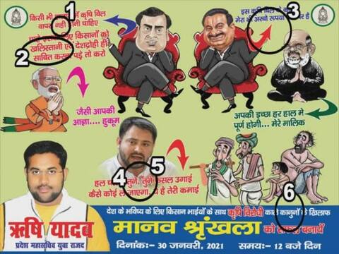 शहीद दिवस पर प्रस्तावित कार्यक्रम से पहले आरजेडी ने पीएम मोदी और ग्रह मंत्री अमित शाह पर निशाना साधा है. ऋषि यादव की ओर से लगाए गए पोस्टर में पीएम नरेंद्र मोदी, गृह मंत्री अमित शाह, मुकेश अंबानी और गौतम अडानी का कार्टून बनाकर कृषि कानून पर निशाना साधा है. वहीं, सरकार पर अंबानी-अडानी से प्रभावित होकर किसानों की मांग ठुकराने का आरोप लगाया है.