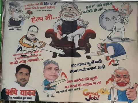 'अरुणाचल प्रदेश तो झांकी था, इ कुर्सिया त अभी बाकी था, काटो जोर लगके' 'वोट हल्का कुर्सी भारी, हल्का करो चलाके गाड़ी' 'हमको भी बिहार में आत्म निर्भर बनने दीजिए'इन जुमलों से सजे पोस्टर लगाने वाले आरजेडी नेता और युवा राजद के महासचिव ऋषि यादव का कहना है कि इसमें गलत क्या है,ये नीतीश कुमार की वास्तविक दशा है भाजपा के साथ. हमने वास्तविकता को तस्वीरों में उकेरा है.
