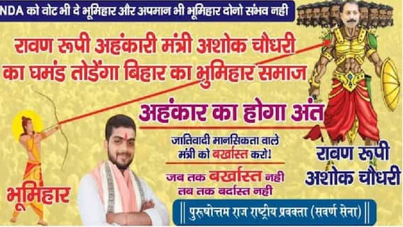 पटना में जेडीयू दफ्तर के बाहर सीएम नीतीश के करीबी मंत्री अशोक चौधरी की बर्खास्तगी की मांग को लेकर पोस्टर लगाए गए हैं. जेडीयू दफ्तर के अलावा शहर में कई जगहों पर ये पोस्टर लगाए गए हैं, जो लोगों का ध्यान खींच रहा है, ये पोस्टर स्वर्ण सेना की ओर से लगाया गया है. अशोक चौधरी ने हाल ही में जहानाबाद में भूमिहार समुदाय पर विवादित बयान दिया था. उनके बयान को लेकर ये पोस्टर लगाए गए हैं. इसमें अशोक चौधरी को रावण के रूप में दिखाया गया है. इसमें बिहार सरकार के मंत्री को दस सिर वाले रावण के रूप में दिखाया गया है. साथ ही लिखा है कि "रावण के रूप में अशोक चौधरी". ये पोस्टर सवर्ण सेना की ओर से लगाया गया है.