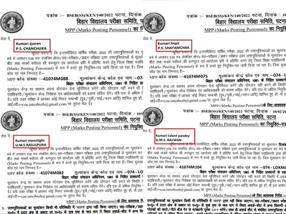 बता दें कि साल 2022 में आयोजित इंटर की परीक्षा की कॉपियां जांचने के लिए 26 फरवरी से सारण के विभिन्न स्कूलों में बिलॉव्ड, वर्जिन, कुमारी टैलेंट पांडेय, कुमारी होप समेत 35 अजीबोगरीब जान वाले शिक्षकों की ड्यूटी लगाई है. हालांकि, पत्र के सार्वजनिक होने के बाद बवाल मच गया है. ऐसा होना लाजमी भी था क्योंकि ऐसे नाम कोई रखता नहीं है. दरअसल, इंटर के कॉपियों के मूल्यांकन में लगाए गए एमपीपी शिक्षकों की बिहार बोर्ड की ओर से जारी अनुमोदित सूची में पूरे मामले का खुलासा हुआ है. ऐसा होने के बाद विभागिय अधिकारियों में हड़कंप मच गया है.