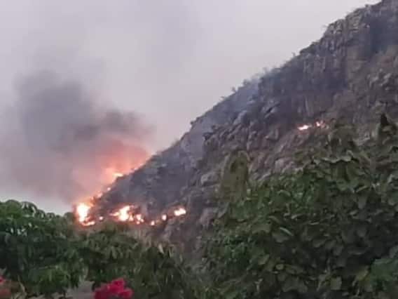 नालंदा: राजगीर के वैभारगिरि पहाड़ पर पिछले 12 घंटे से लगी है आग लगी हुई है. इस दौरान पहाड़ पर विभिन्न प्रकार के दूर्लभ जड़ी-बूटियों और कई प्रजातियों के पेड़-पौधे जलकर राख हो गए हैं. खबर लिखे जाने तक भी आग पर काबू नहीं पाया जा सका था. सोमवार (17 अप्रैल) की सुबह आग की सूचना मिलने के बाद डीजी शोभा अहोटकर राजगीर पहुंचीं. नालंदा के डीएम, डीएफओ सहित अन्य पदाधिकारी और कर्मी राजगीर के वैभारगिरि पर्वत की तलहटी पहुंचे.