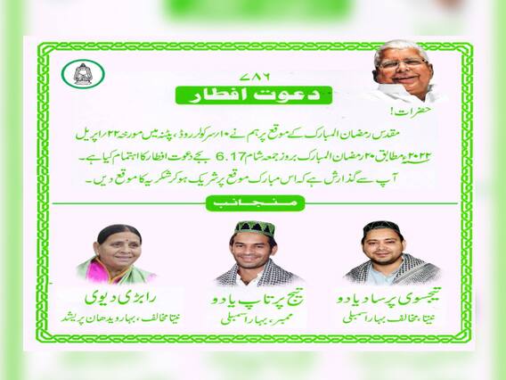 आगे कहा कि जब लालू सीएम थे तो इफ्तार पार्टी के निमंत्रण पत्र में उनकी तस्वीर रहती थी. जब राबड़ी सीएम बनीं तो आरजेडी के इफ्तार पार्टी के निमंत्रण पत्र में लालू राबड़ी की तस्वीर रहती थी. तेजस्वी नेता प्रतिपक्ष हैं. वह इफ्तार पार्टी दे रहे हैं. आमंत्रण पत्र में उन्होंने अपने माता पिता, अपना, भाई का तस्वीर लगाई है. उनके भाई तेज प्रताप यादव विधायक हैं. आमंत्रण पत्र में जो भी तस्वीर है उससे आरजेडी के किसी नेता को कोई दिक्कत नहीं है.