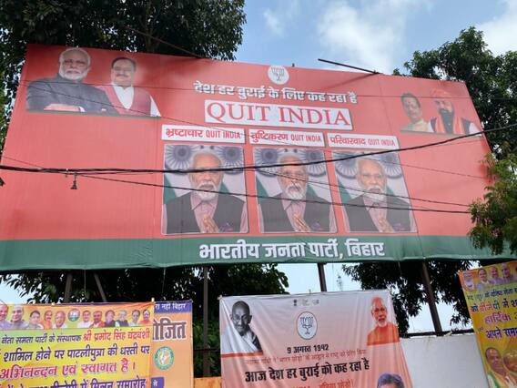 पटना: 81 वर्ष पूर्व गुलाम भारत में राष्ट्रपिता महात्मा गांधी (Mahatma Gandhi) ने नौ अगस्त 1942 को अंग्रेजों भारत छोड़ो का नारा दिया था. इसके बाद से देश में आजादी की लहर दौड़ गई थी. पांच साल बाद 1947 में देश आजाद हुआ, लेकिन बीजेपी (BJP) अब उस दिन को याद करके राजनीतिक फायदा लेने में जुट गई है. बीजेपी की ओर से गुरुवार को प्रदेश कार्यालय के बाहर दो पोस्टर लगाया गया है. पोस्टर में सबसे ऊपर लिखा है कि देश हर बुराई के लिए कह रहा है 'क्विट इंडिया'. इसके नीचे प्रधानमंत्री नरेंद्र मोदी (Narendra Modi) की तीन बड़ी तस्वीर लगाई गई है. एक तस्वीर के ऊपर लिखा गया है भ्रष्ट्राचार क्विट इंडिया (Quit India), दूसरे में तुष्टिकरण क्विट इंडिया और तीसरी तस्वीर में परिवारवाद 'क्विट इंडिया' लिखा गया है.