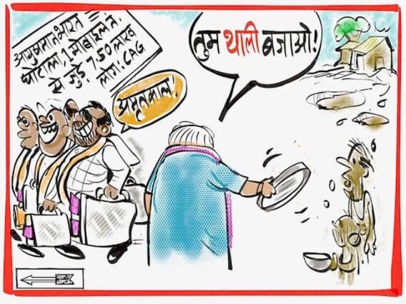 जेडीयू ने आयुष्मान भारत योजना को लेकर सीएजी की रिपोर्ट पर एक कार्टून के जरिए मोदी सरकार को आडे़ हाथों लिया है. इस कार्टून में पीएम मोदी जैसे सांकेतिक व्यक्ति गरीब व्यक्ति को थाली देते दिख रहा है. साथ ही लिखा है कि 'तुम थाली बजाओ'. वहीं, इस कार्टून में दूसरी तरफ लिखा है कि 'आयुष्मान भारत घोटाला, एक मोबाइल नंबर से जुड़े 7.5 लाख लोग-सीएजी' और इसके नीचे कुछ लोगों को हंसते हुए दिखाया गया है और लिखा है 'अमृतकाल'
