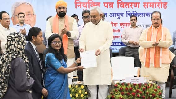 Nitish Kumar News: सीएम नीतीश कुमार (Nitish Kumar) ने गुरुवार को मुख्यमंत्री सचिवालय स्थित 'संवाद' में स्वास्थ्य विभाग के अंतर्गत नवनियुक्त आयुष चिकित्सकों को सांकेतिक रूप से नियुक्ति पत्र प्रदान किया. कार्यक्रम के दौरान उपमुख्यमंत्री सह स्वास्थ्य मंत्री तथा नगर एवं आवास विभाग के मंत्री सम्राट चौधरी (Samrat Chaudhary) और उपमुख्यमंत्री विजय कुमार सिन्हा (Vijay Kumar Sinha) ने भी नवनियुक्त आयुष चिकित्सकों एवं सहायक अभियंताओं को सांकेतिक रूप से नियुक्ति पत्र प्रदान किया. स्वास्थ्य विभाग के अंतर्गत 2901 नवनियुक्त आयुष चिकित्सकों तथा नगर विकास एवं आवास विभाग के अंतर्गत 219 सहायक अभियंताओं को नियुक्ति पत्र प्रदान किया गया.
