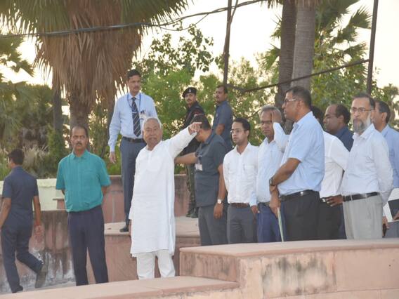 नालंदा: बिहार के मुख्यमंत्री नीतीश कुमार (Nitish Kumar) शुक्रवार की शाम सड़क मार्ग से पटना से राजगीर (Rajgir) पहुंचे. नीतीश कुमार के आगमन को लेकर चप्पे-चप्पे पर सुरक्षा कर्मियों की तैनाती की गई थी. मुख्यमंत्री नीतीश कुमार के राजगीर सर्किट हाउस पहुंचते ही जेडीयू (JDU) कार्यकर्ताओं ने उनका स्वागत किया. इसके बाद मुख्यमंत्री नीतीश कुमार ब्रह्मकुंड पहुंचे, जहां इन्होंने ब्रह्मकुंड में लगभग 20 मिनट तक घूम-घूमकर निरीक्षण किया. ब्रह्मकुंड का निरीक्षण करने के बाद मुख्यमंत्री नीतीश कुमार सरस्वती नदी का भी निरीक्षण किया. इसके बाद उन्होंने राजगीर में होने वाले मलमास मेला (Malmas Fair) की तैयारियों को लेकर राजगीर कन्वेंशन सेंटर में पदाधिकारियों के साथ बैठक की. इस दौरान कई दिशा निर्देश भी दिए.